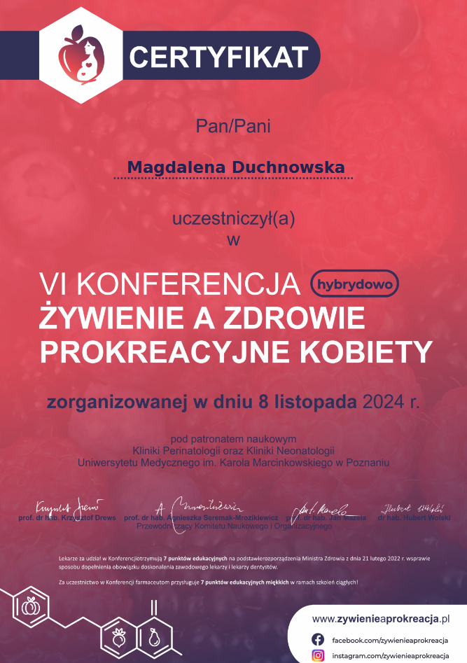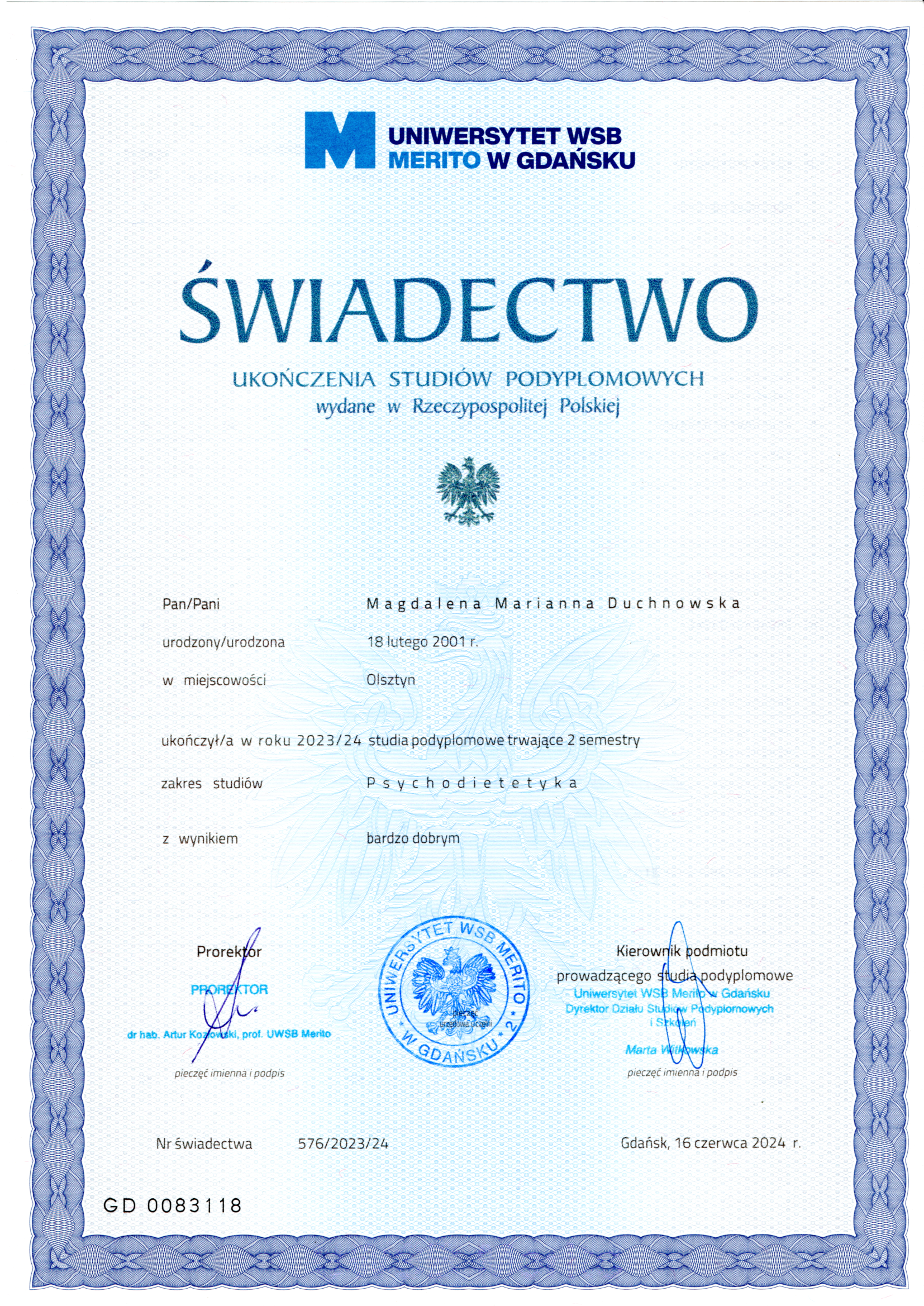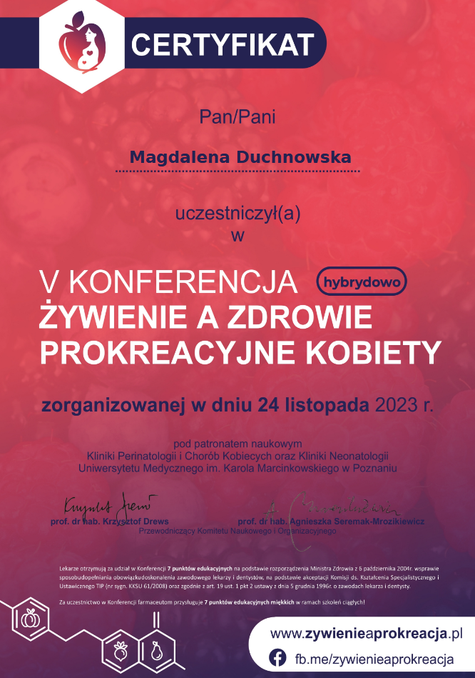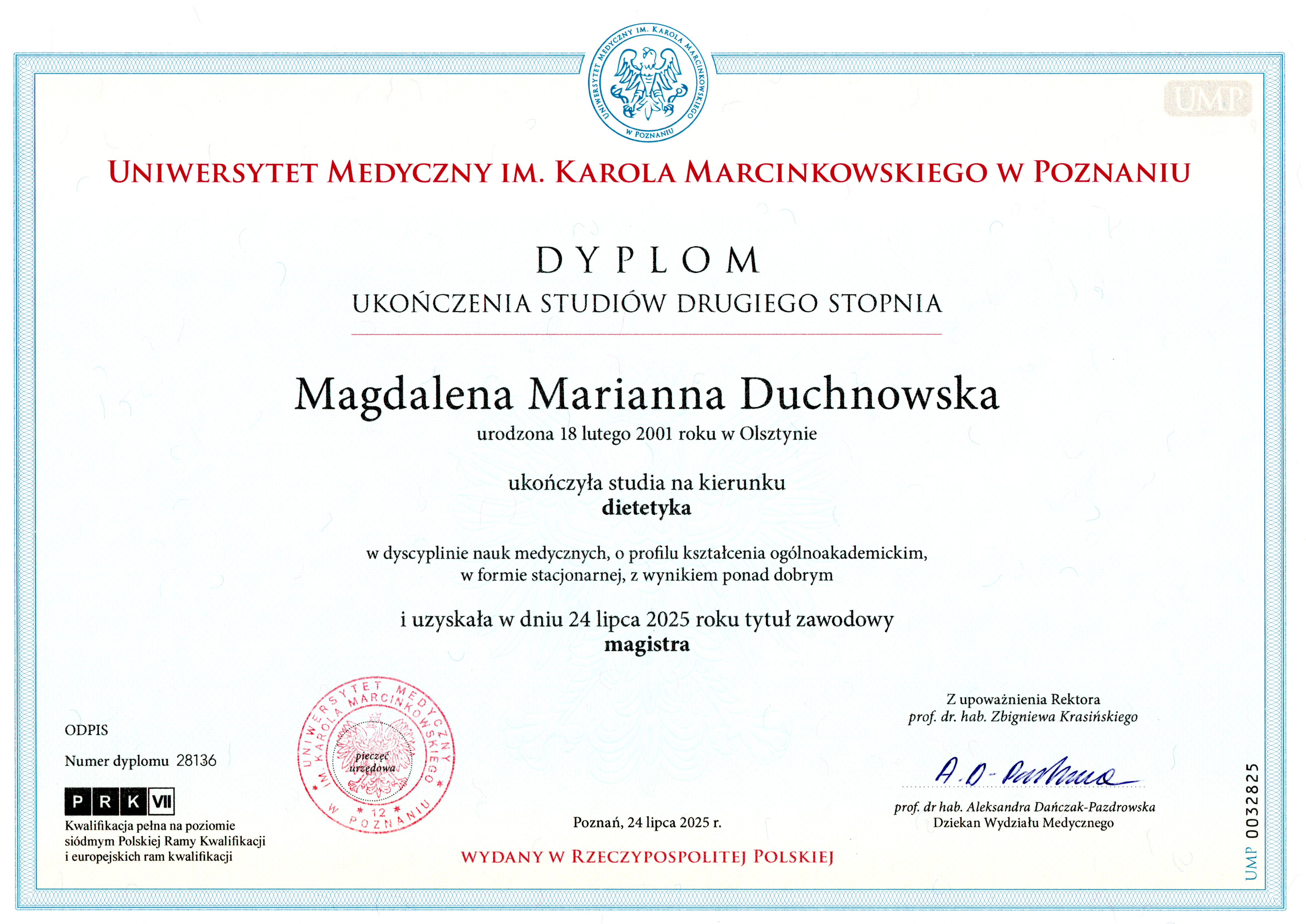 Wiedzę kliniczną zdobywałam na Uniwersytecie Medycznym im. Karola Marcinkowskiego w Poznaniu, gdzie ukończyłam studia magisterskie na kierunku dietetyka. Uzupełnieniem tej wiedzy były studia podyplomowe z psychodietetyki na Uniwersytecie WSB Merito w Gdańsku, które pozwoliły mi lepiej zrozumieć emocjonalne i psychologiczne aspekty odżywiania.