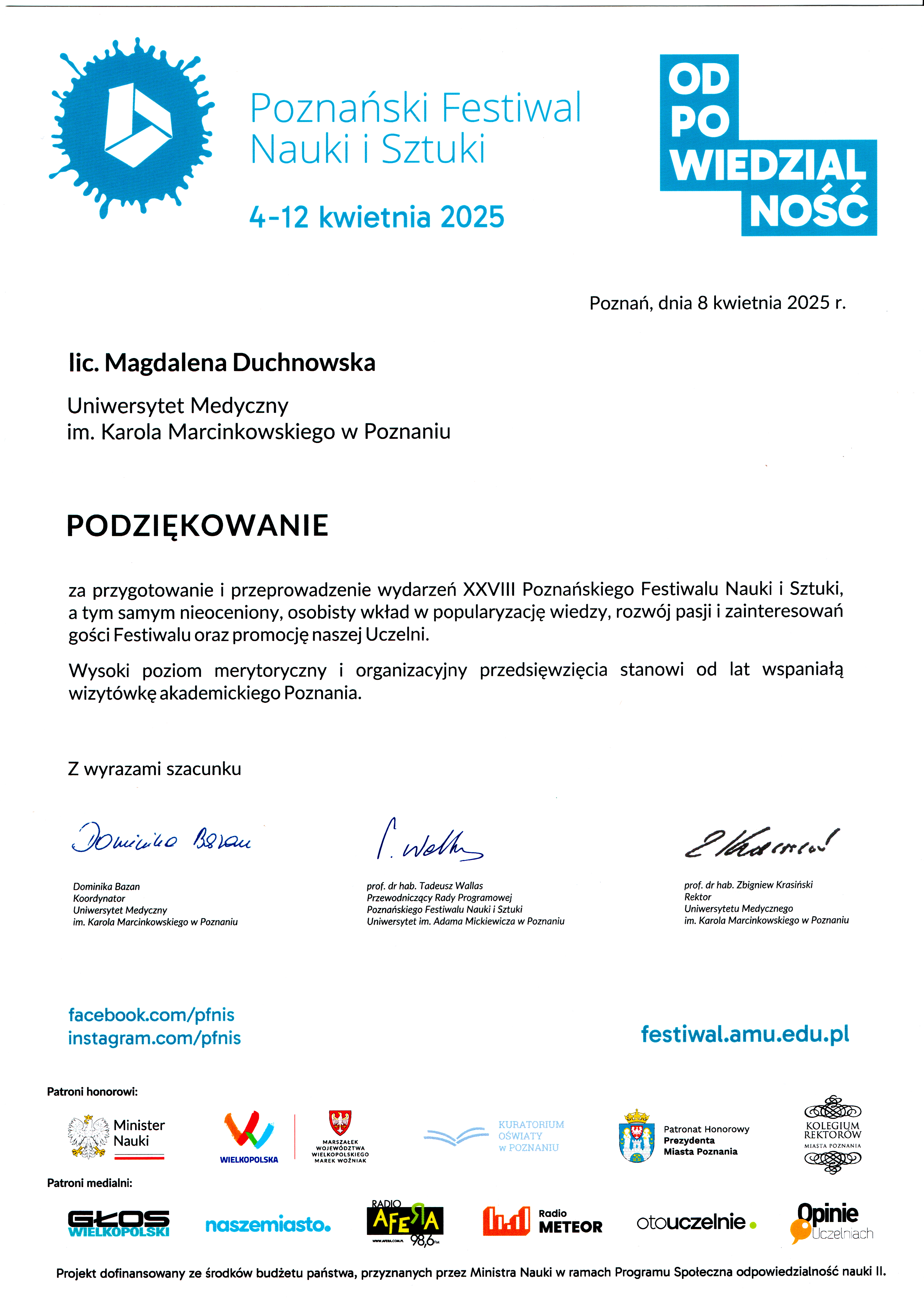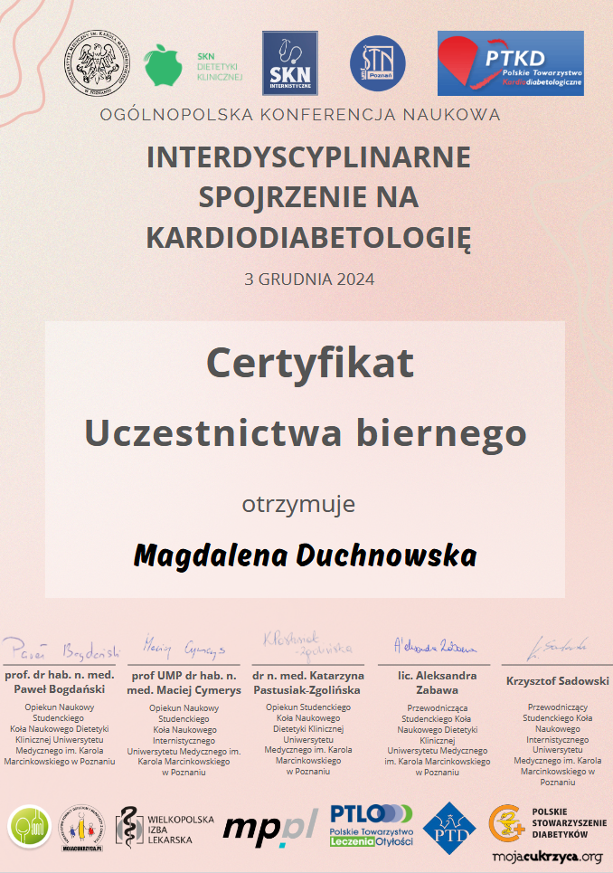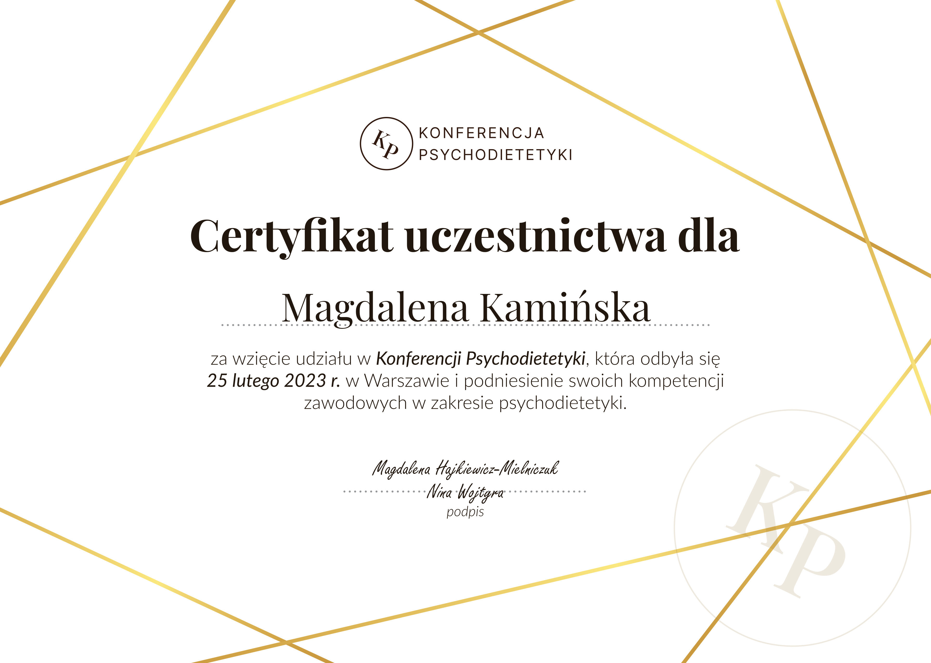 Wiedzę kliniczną zdobywałam na Uniwersytecie Medycznym im. Karola Marcinkowskiego w Poznaniu, gdzie ukończyłam studia magisterskie na kierunku dietetyka. Uzupełnieniem tej wiedzy były studia podyplomowe z psychodietetyki na Uniwersytecie WSB Merito w Gdańsku, które pozwoliły mi lepiej zrozumieć emocjonalne i psychologiczne aspekty odżywiania.